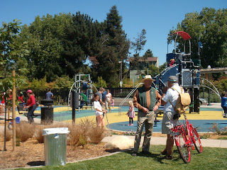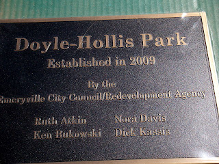 (clockwise from left) AC Transit Board official Greg Harper (left), former Emeryville Mayor and Councilman, chats with fellow Emeryville resident; commemorative and self-congratulatory plaque paid for with your tax dollars (an estimated $1,000). Councilman John Fricke, who designed the play structure and was the most vocal supporter of the park (the other 4 Council Members initially opposed it) said he felt the plaque was in bad taste and asked that his name be left off; Council Members (from left) Nora Davis, Mayor Dick Kassis, Ruth Atkin, and Vice-Mayor Ken Bukowski do the honors.